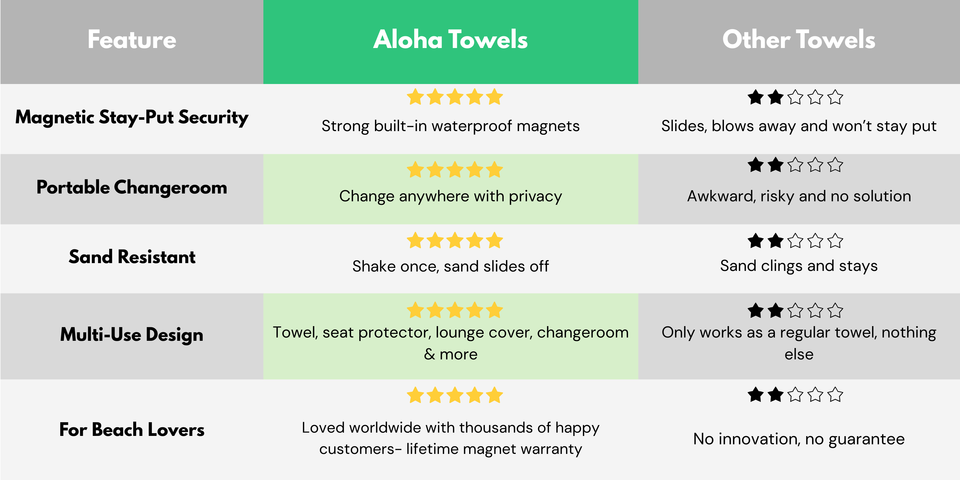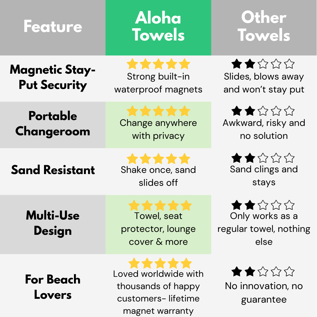 Stop wasting money on flimsy towels that don’t last. The Aloha Towel is built to do more — and make every beach day easier.